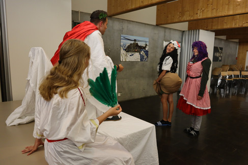 Am Abend dann eine weitere Botschaft. Caesar hat unsere Fahnen entdeckt und möchte die berühmt-berüchtigten Wolhuser kennenlernen und unterhalten werden. So wurde die ganze Dorfbevölkerung zusammengetrommelt. Mit Szenen aus dem täglichen Gallierleben, wurde Caesar unterhalten. Seine Damenbegleitungen und er wurden genussvoll amüsiert und hinterliessen ein positives Feedback und so konnten die Gewinner die Segnung von Caesar entgegennehmen.